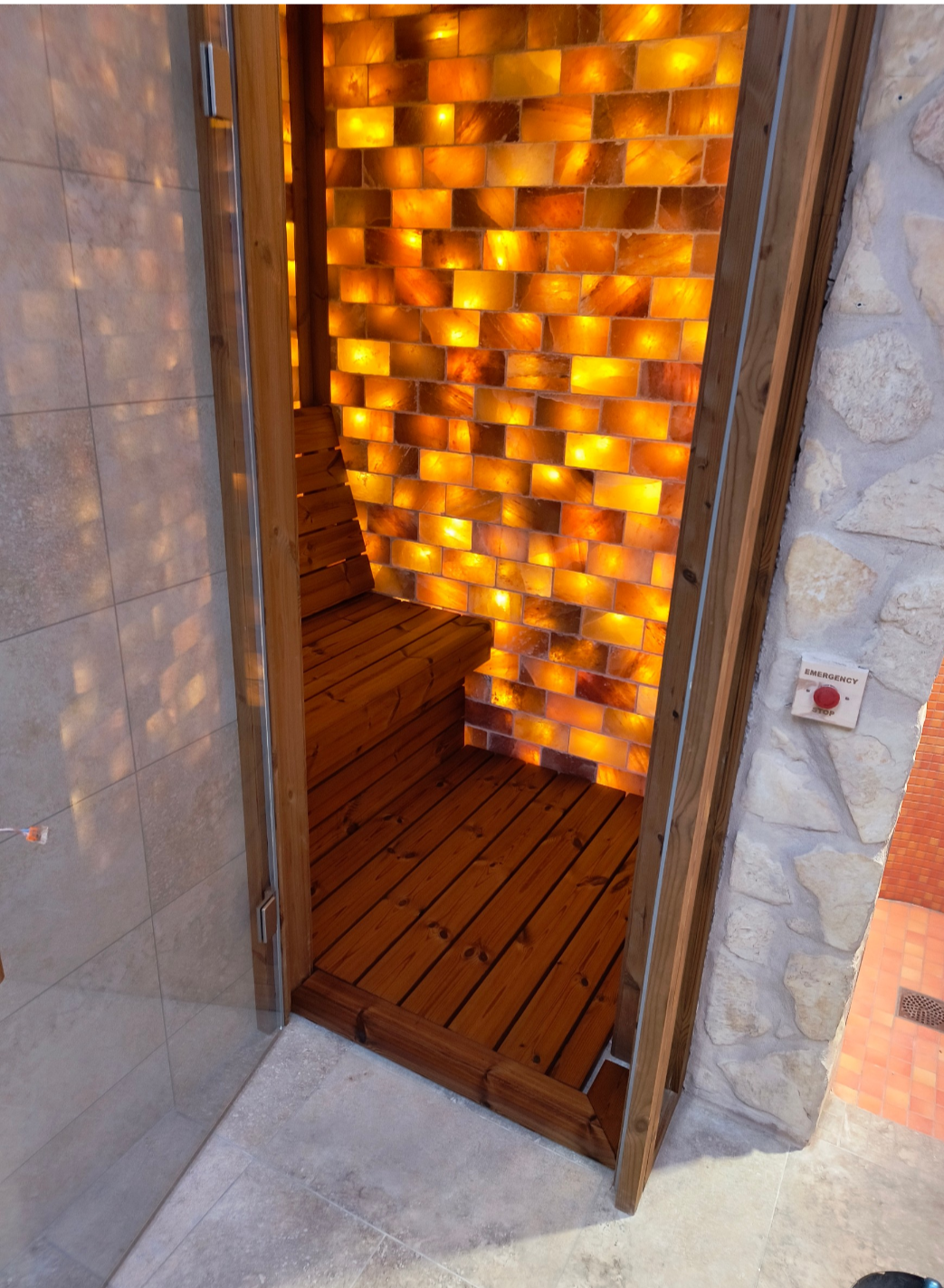 Himalájska soľná tehlička do sauny uľahčuje dýchanie v saune. Z tehličiek možno stavať steny, ktoré možno podsvietiť, alebo je možné tehličky len postaviť na lavici v saune či na polici v saune - postupne sa bude uvoľňovať soľ a blahodarné soľné ióny. Vhodné sú minimálne 2-3 tehličky pre pozitívny účinok v saune. Možno kúpiť aj samostatne. Rozmery 200 x 100 x 50mm s drážkami pre jednoduchú výstavbu soľných stien...